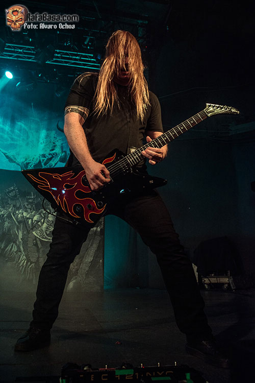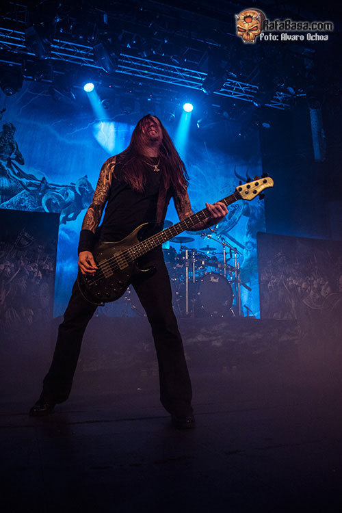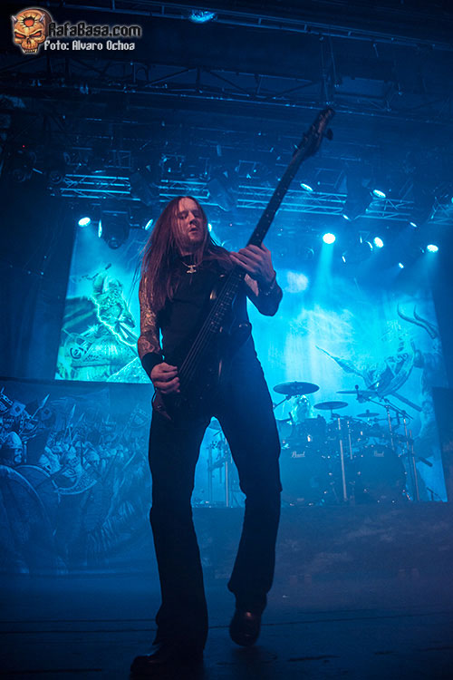 Fieles a su filosofía, no faltó la indumentaria vikinga de sus componentes, personificada especialmente en la figura de su barbudo vocalista Johan Hegg, quien fue el encargado de capitanear a sus compañeros a lo largo de embestidas épicas como "Live For The Kill", que, tras los primeros parlamentos de la noche, sería la encargada de adentrarnos en el material clásico de la banda, con la imparable batería de Fredrik Andersson conduciéndonos a la batalla. Sin abandonar el material de «Twilight Of The Thunder God» (2008), la siguiente en hacer acto de presencia, ante una audiencia completamente extasiada, fue "Varyards Of Miklagaard", con banda y público en perfecta sintonía, saltando al unísono arrastrados por su implacable voracidad metalera.