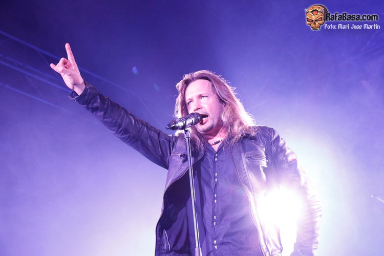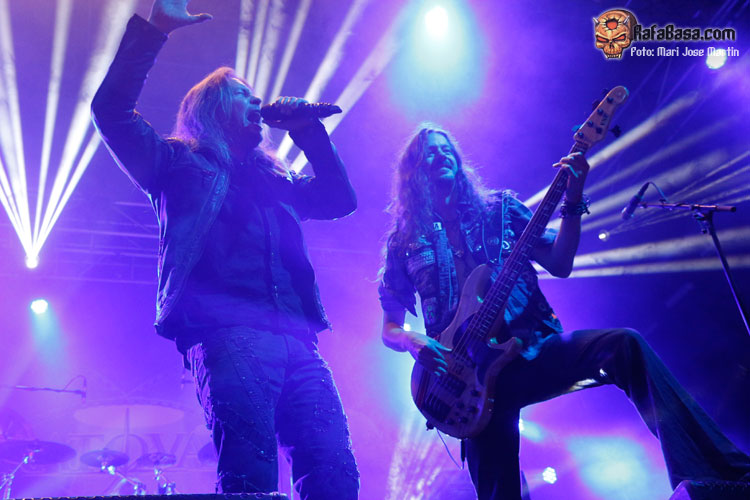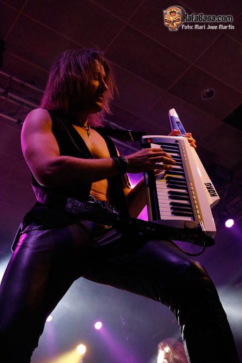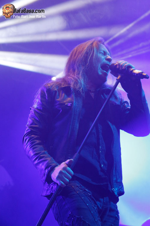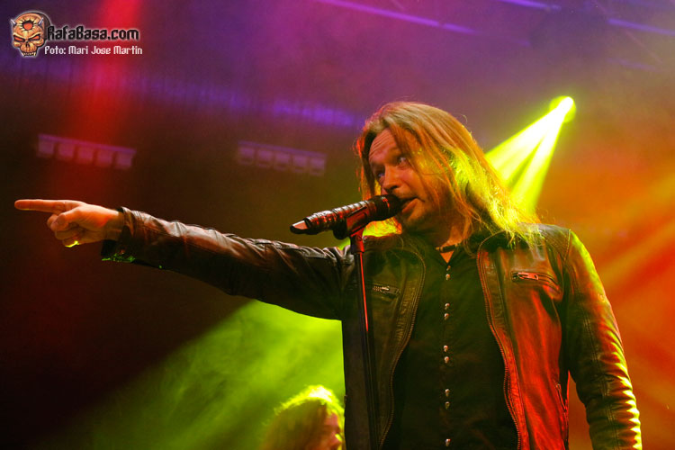En cualquier caso, el repaso a su trayectoria contó con representaciones de muy diferentes épocas. Por supuestoque hubo hueco para presentar «Eternal», además con la banda funcionando a la perfección. Kotipelto se ha venido rodeando de músicos de indiscutible nivel en cada puesto. No vamos a presentar a estas alturas a Jens Johansson, superviviente de la vieja guardia en el grupo. Pero es que el resto de instrumentistas no se quedan atrás. Ya venimos conociendo a Matias Kupiainen a la guitarra, técnicamente intachable aunque pueda resultar algo frio en escena. Todo lo contrario ocurre con Lauri Porra, que aparte de ser un gran bajista se convierte en un segundo frontman. Se le ve sonriente y feliz, ocupando todo el escenario, apareciendo al lado de cualquiera se sus compañeros. Su solo de bajo aparte de servir para dar respiro a la banda, fue una demostración de su gran nivel. Por otro lado, Rolf Pilve se ha hecho con el puesto de batería con plenas garantías, y eso que sustituir a Jörg Michael dejaba el listón muy alto. Además hoy era el cumpleaños del actual batería de STRATOVARIUS, celebrado con champán en el mismo escenario y solo incluido. Kotipelto por su parte supo guardar muy bien el tipo en los viejos temas, tal vez aprendiendo con el tiempo a no intentar llegar a los tonos más altos cueste lo que cueste, sino guardando cuando hace falta.