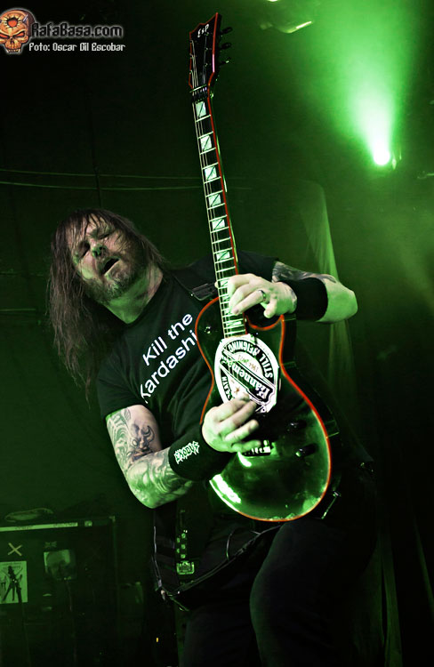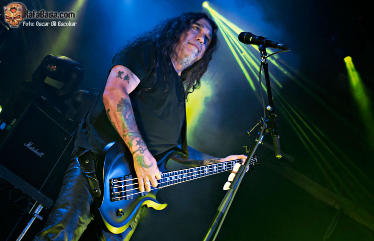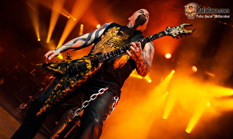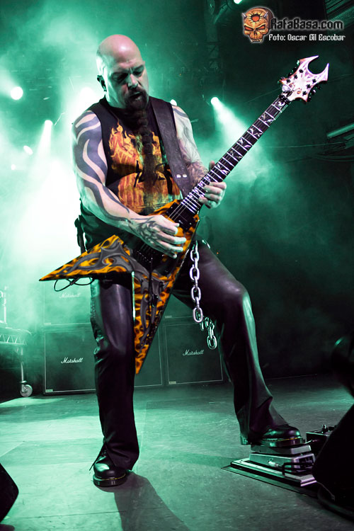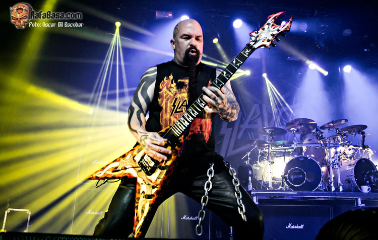 Lo de que a Gary Holt le viene muy grande el tema debe de ser una broma. Un respeto. Es como si decimos que a Satriani le viene grande tocar en Dream Theater. Menudo recital que dio el tío. Gary Holt es bastante mejor guitarrista que Hanneman, de aquí a Lima. Con todos los respetos para Hanneman, al que idolatro. Probablemente en cuanto a capacidad de composición puede que el legado de Hanemman sea algo superior, pero en la ejecución (precisión, rapidez y fluidez) no hay color. Es posible que no clavara algún solo, pero no estuvo lejos. Iría sobrado en cualquier banda del estilo en la que tocase. Se dejó el cuello en cada riff, no se donde alguien puede ver pasividad en su actuación. Se nota que disfruta tocando esas grandes canciones cada noche y obteniendo el reconocimiento (y los dólares) que en su gran banda nunca tuvo, incomprensiblemente.