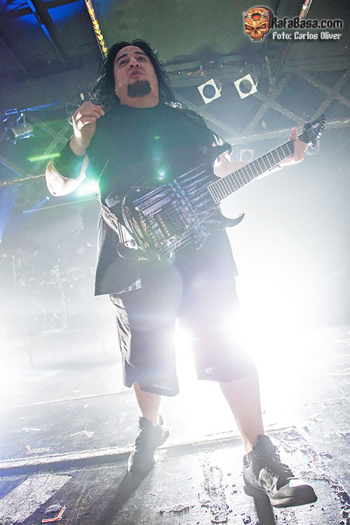 Otro detalle que me llamó la atención fue lo activos que se mantuvieron Dino Cazares y Tony Campos a lo largo de todo el show, intercambiando constantemente sus posiciones para animar al personal y conseguir que el ambiente nunca decayese, y más cuando el cuarteto desempolvó la artillería pesada y nos espetó sin previo aviso un celebradísimo «Replica», que hacia que la sala se viniera literalmente abajo. Mientras las primeras filas intentaban recuperar el aliento, Burton volvía a agradecernos nuestra presencia antes de que el escenario se tiñiera de rojo y la fiesta prosiguiera con esa rotunda bofetada que fue «New Breed», que era la escogida para que la banda volviera a pisar el acelerador al máximo mientras la gente se desgallitaba a la hora de corear su estribillo.