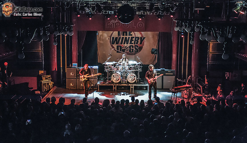 Ante una sala abarrotada, con los anfiteatros de la parte superior abiertos, un escenario sobrio, -decorado con un gran telón trasero con el logo de la banda y un discreto set de teclados esquiando en la parte derecha-, aguardaba el inminente desembarco de la formación californiana. Acompañados de una calurosa bienvenida, acorde con la trayectoria y la calidad de sus miembros, el trío irrumpía en escena para poner de manifiesto desde que arrancarán con la novedosa "Oblivion" que en el seno de THE WINERY DOGS no hay lugar para las luchas de egos ni para los liderazgos superfluos, ya que lo que prima es el colectivo. Esto no quiere decir que los tres virtuosos no tuvieran ocasión de mostrarnos sus excelsas habilidades técnicas, ya que a lo largo del show fueron múltiples las demostraciones que nos ofrecieron. El primero en dejarnos una buena muestra de su pericia sería Billy Sheehan haciendo volar los dedos sobre el mástil de su bajo durante los intensos desarrollos del setentero "Captain Love".