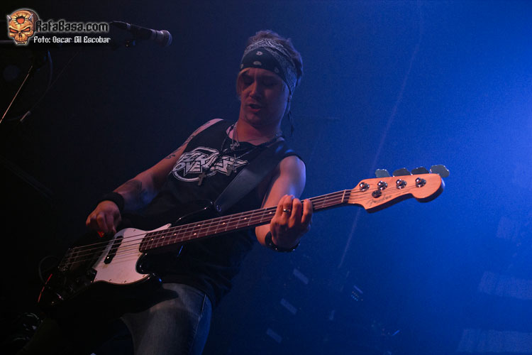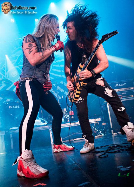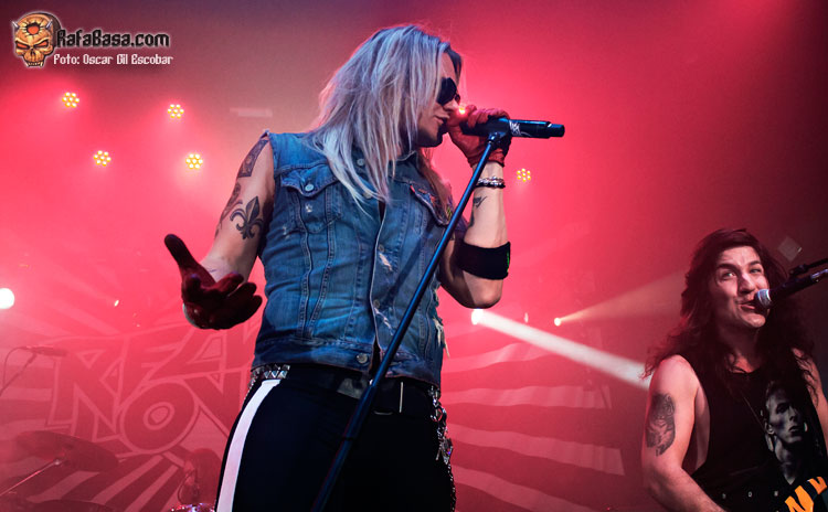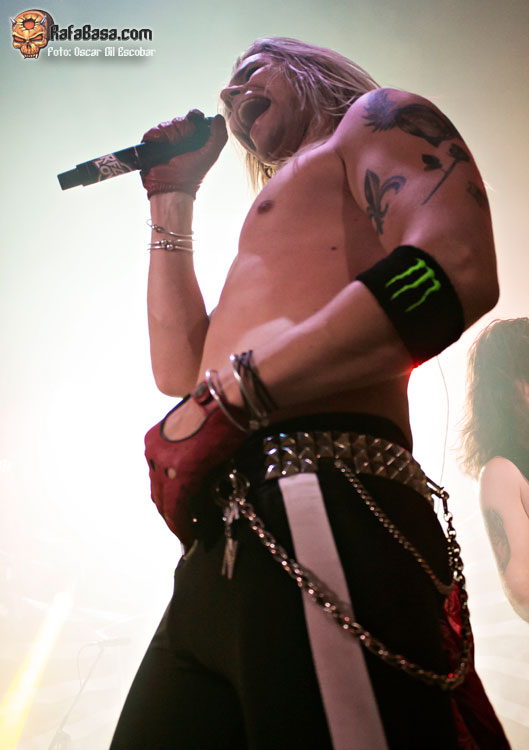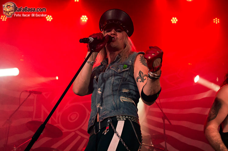 «InVader» es el nuevo disco que presentaban esta noche los fineses RECKLESS LOVE, con un sonido más ‘popero’ y moderno y era todo un reto ver cómo sonaban algunas de estas composiciones en directo. Con Olli Herman a la voz, Pepe a la guitarra, Jalle Verne al bajo y Hessu Maxx tras los platos arrancaba el show. Para empezar sonaba la intro de «Boys Are Back In Town» de THIN LIZZY, que dejaba ver tras la apertura de la famosa cortina que cubre este escenario una producción más que interesante, ya que la banda traía un telón con su logo al fondo y un juego de luces que mejoraba bastante las características propias de Caracol. Musicalmente hablando arrancaban con uno de los himnos de la banda, y es que «Animal Attraction» tiene ese estribillo pegajoso y ese riff principal de Pepe que suena a las mil maravillas.