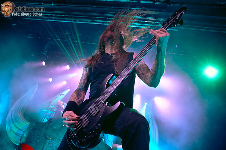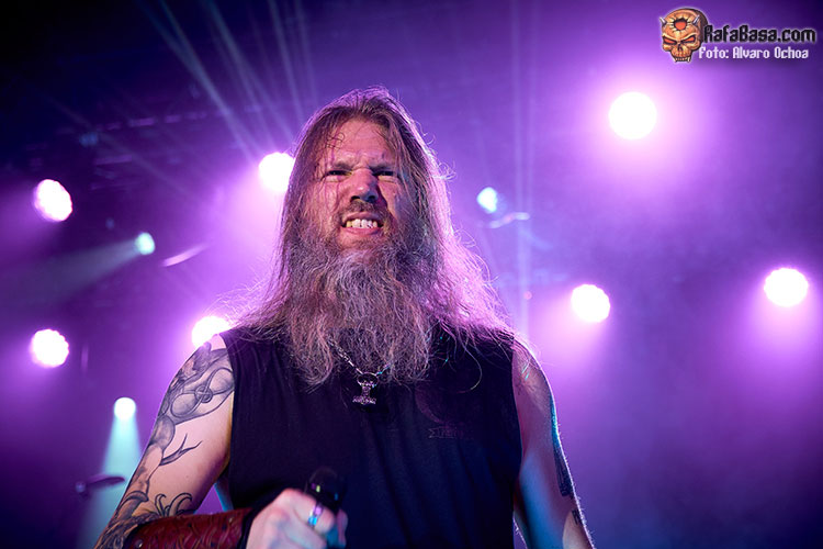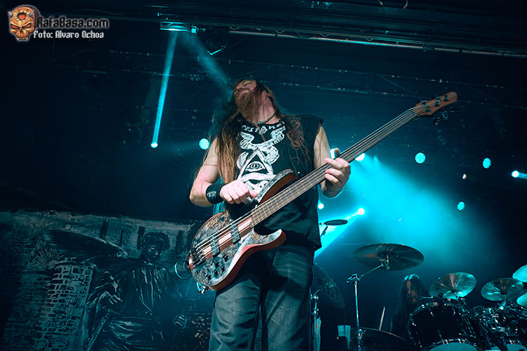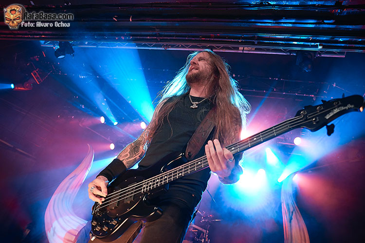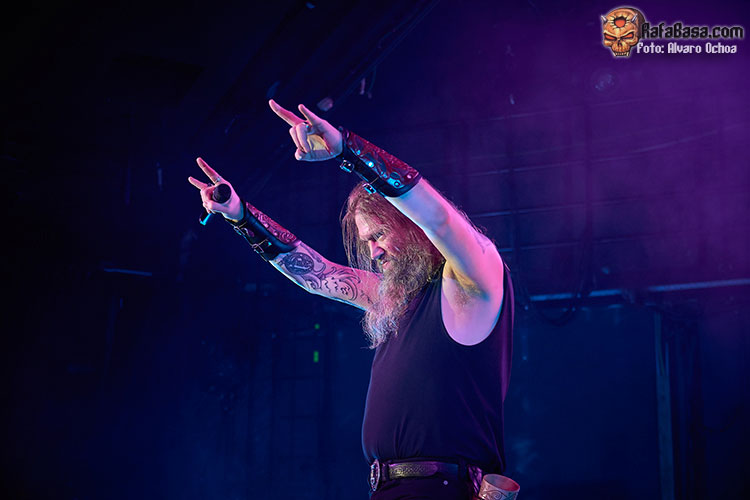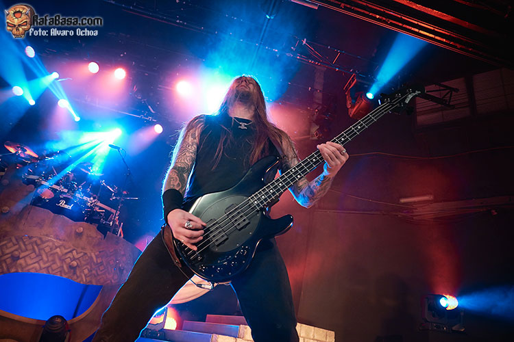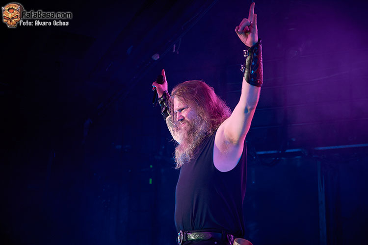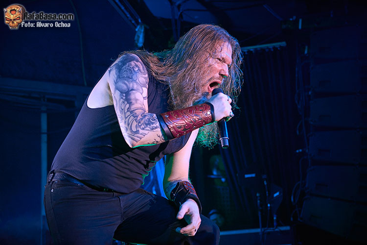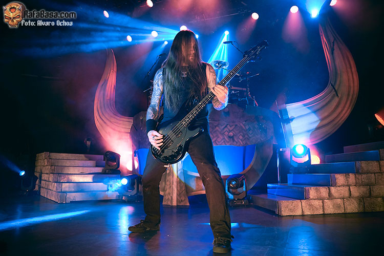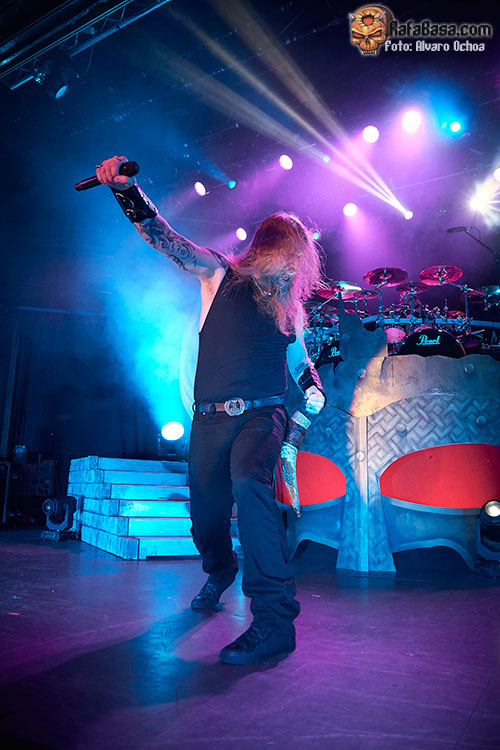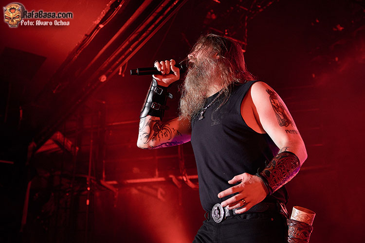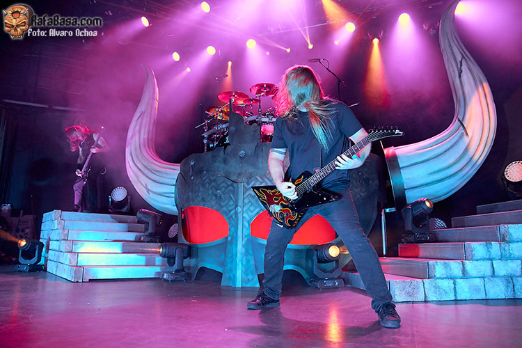 Nada menos que diecisiete temas descargaron los vikingos suecos en Madrid. Decir que durante todos y cada uno de los temas, la voz del enorme Johan Hegg se podía escuchar atronadora cuál martillo de Thor, y que el resto de la banda, Olavi, Ted y Johan no dejaron de moverse por el escenario. Increíble el vozarrón del que hace gala Johan. Durante toda la actuación no dejaban de salir al escenario vikingos ataviados con cotas de malla, cascos, escudos, hachas, lanzas, espadas, etc…. lo que daba vistosidad al show ofrecido por los de Estocolmo. «As Loke Falls» «First Kill» y «The Way Of The Vikings» siguieron a «Pursuit Of Vikings». Dos enormes vikingos con espadas y escudos de enzarzaban en una lucha sobre el escenario donde solo quedó uno.