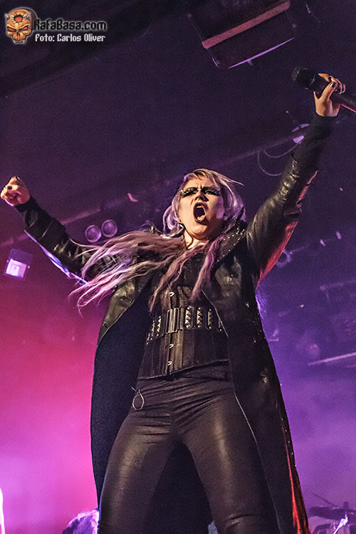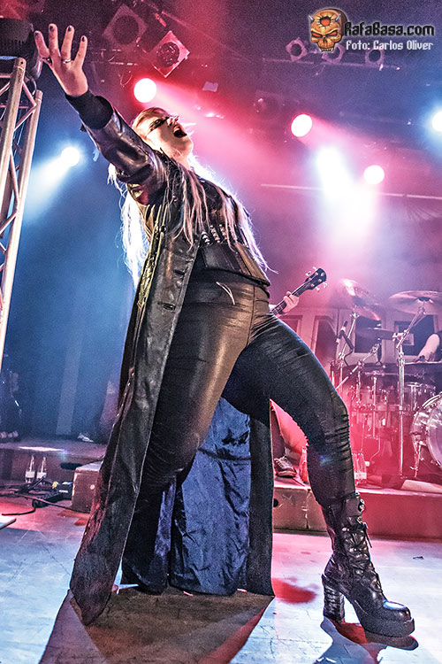 El momento de menear las caderas llegaría con «Touch In The NIght», un tema de su anterior redondo «Unholy Savior», que ya nos adelantaba esa orientación más moderna e incluso bailable que llevaría el material contenido en «Bringer Of Pain». Tampoco faltaría durante el show la invocación a todos los vikingos catalanes para que se sumaran a los estribillos del novedoso «Bastard Son Of Odin», que lograba que la sala se viniera abajo mientras las columnas de humo volvían a flanquear la figura de la vocalista para abocarnos sobre un final épico. Sin apenas tiempo para reponernos del impacto la base rítmica nos adentraría en «Enter The Metal World» y una apabullante «Out Of Control», que sería la escogida para poner el punto y seguido a la velada.