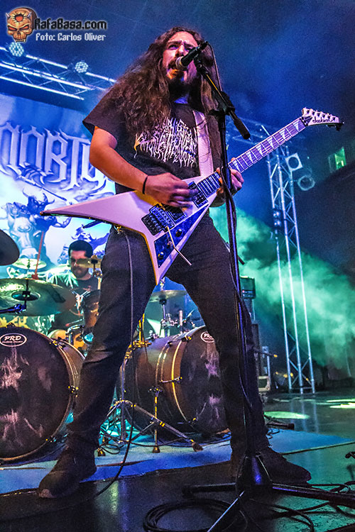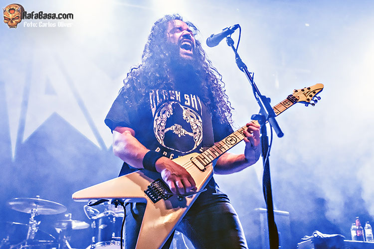 Mientras la gente accedía al recinto escalonadamente saltaban a escena los encargados de inaugurar la velada, EXMORTUS. Con la imponente portada de su último redondo «Ride Forth» presidiendo el escenario el cuarteto de Whittier nos ofreció una buena dosis de potencia y virtuosismo, dando buena cuenta de su thrash/ death salpicado de pinceladas neoclásicas. Pese a ello, durante los primeros compases de su actuación Jadran «Conan» González y sus secuaces optarían por captar nuestra atención recurriendo a las estructuras clásicas y a los rotundos riffs que marcaron piezas como «Foe Hammer» o la hímnica «For The Horde».