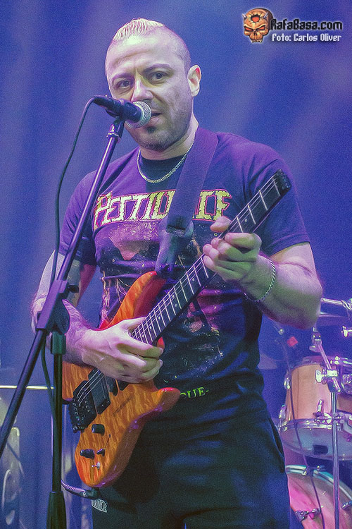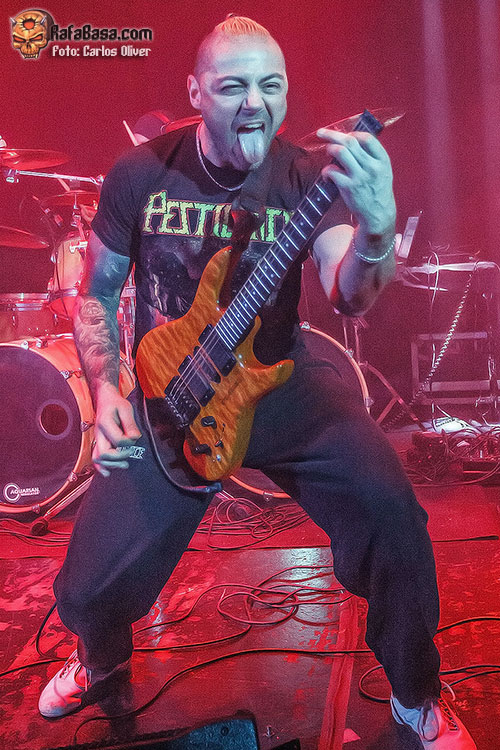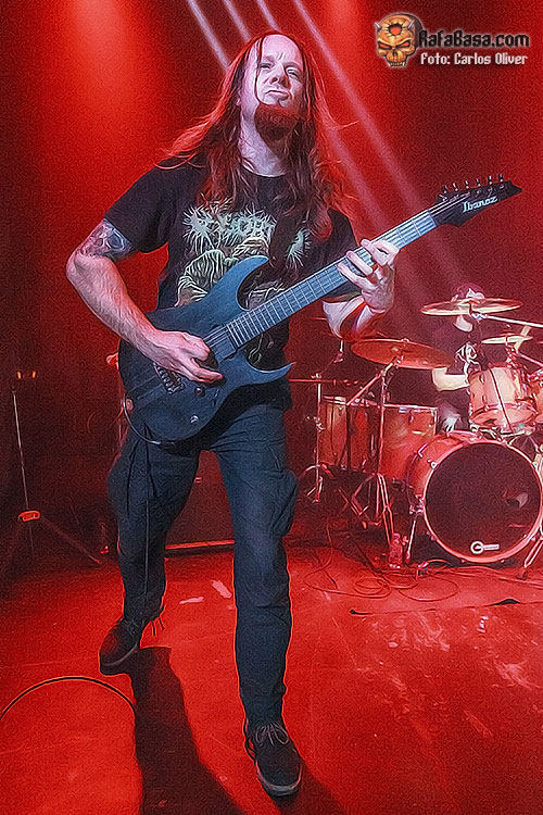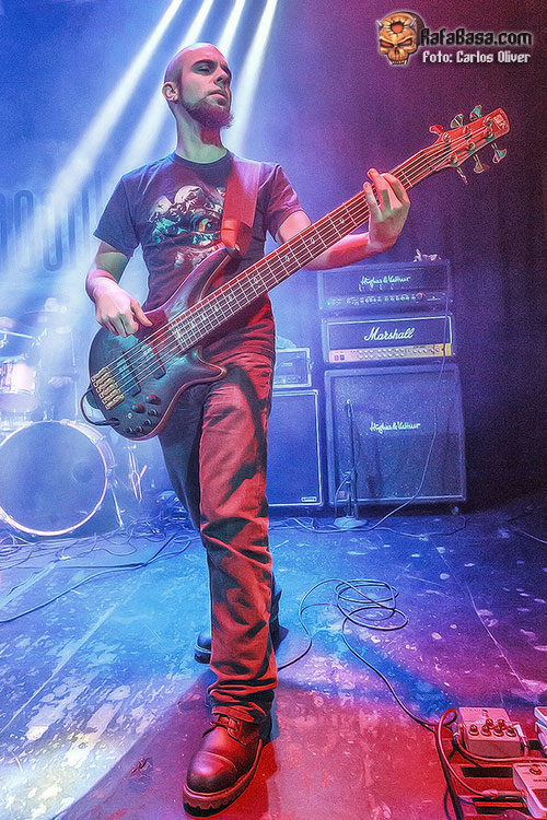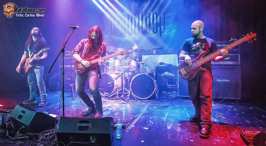 Pero no era esta la única actuación de la noche, ya que justo antes de que PESTILENCE nos sumergieran de lleno en la nostalgia contaríamos con el concurso de MOONLOOP, una formación que ostenta tablas, talento, veteranía, y que ha dejado plasmada su excelsa calidad instrumental en sus entregas de estudio. Nadie quería perderse la descarga de Eric Baulenas y sus muchachos, así que cuando empezó a sonar su introducción la sala presentaba ya un fantástico ambiente. Como ya sucediera en anteriores ocasiones, Eric volvió a erigirse como el líder y motor de los barceloneses, atrayendo gran parte de las miradas desde que nos deleitara con el virtuoso arranque de “Megalodon”. Pero que nadie piense que el resto de sus compañeros no estuvieron a la altura, ya que todos rayaron a un excelente nivel, destacando especialmente el concurso del bajista Vic Granell, que dio todo una exhibición a la hora de atacar las seis cuerdas de su bajo durante los laberínticos desarrollos de “A Life Divided”, que se convertía en el primer guiño a “Deeply From The Earth”.