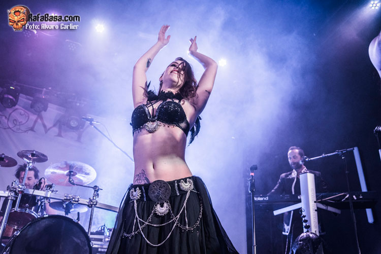 Engalanado con celosías y unas lámparas de suelo preciosas, así como bañado en una profunda luz púrpura, lucía un escenario que pronto daría cobijo a la danza de la zíngara que, en varias ocasiones, añadiría una nota de color con su interpretación a la estupenda música de MYRATH.
