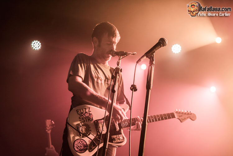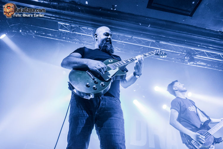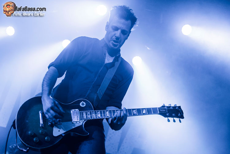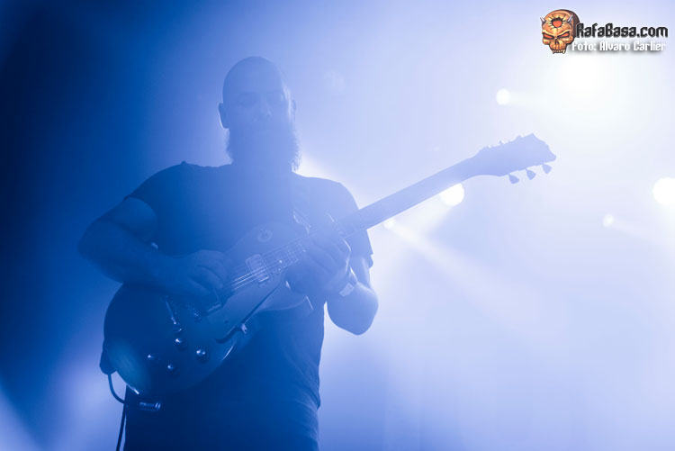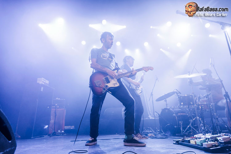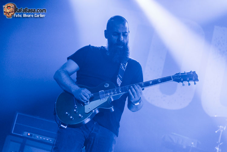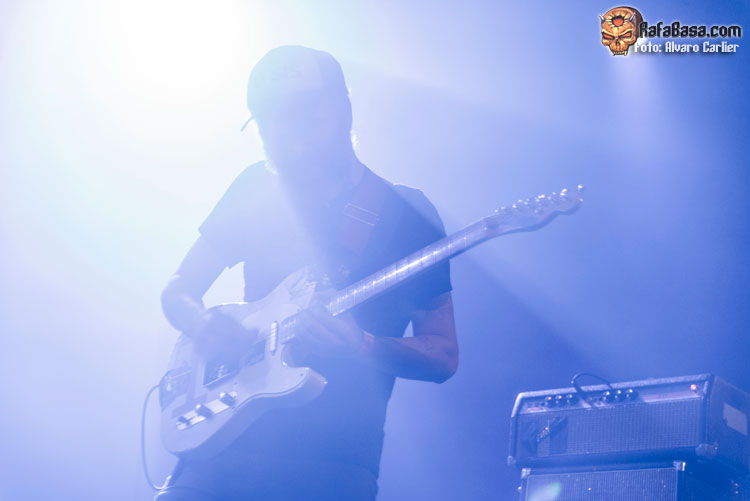 No hubo que esperar demasiado para el último apagón. TOUNDRA tenían ya desplegado el gran telón con su logo, el de las grandes citas, y “Cobra” fue un poco como la noche de Reyes, que uno la ve venir pero aun así no puede esperar a que llegue. Fue el inicio anunciado, con un buen sonido desde los primeros acordes y quizás un grupo que salió algo menos desatado que otras veces, por lo que sea, algo más contemplativo esta vez pero visiblemente felices de tener La Riviera prácticamente llena, toda para ellos, una vez más. “Tuareg” volvía a adentrarnos en el paisaje desértico y extraterrestre de “Vortex”, un tema que fue celebrado como si de un clásico se tratase (en parte ya lo es), y que enlazó de cine con pasajes de enorme preciosismo y dinámica ‘in crescendo’ marca de la casa. No había tiempo para descansos.