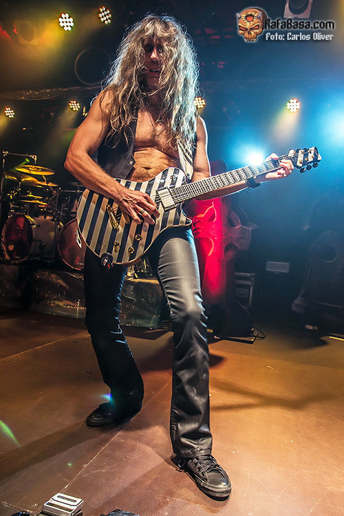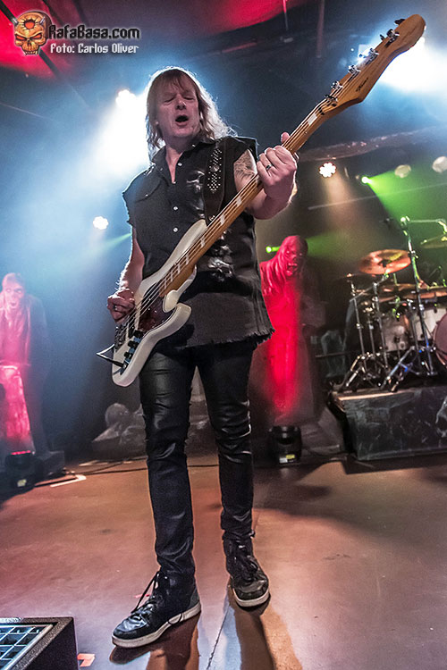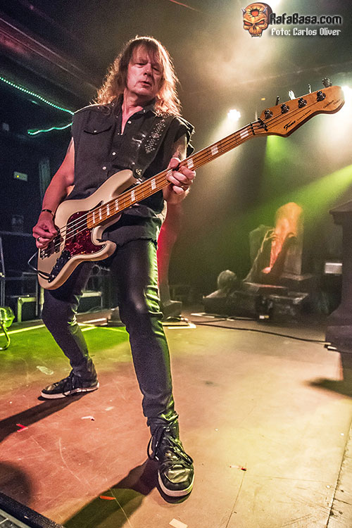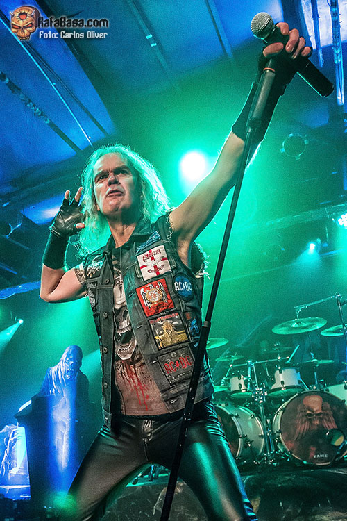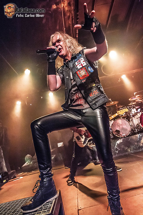 Recibiendo la cálida acogida del respetable mientras a través del P.A. sonaba una oscura e inquietante introducción aparecía en escena una lúgubre figura encapuchada: The Reaper, para animar al personal a que acompañara con palmas la entrada de los miembros de la banda para dar por inaugurada la velada con un trallazo directo e incontestable como es el novedoso “Fear Of The Living Dead”, con el que dejaban claro que sus nuevas composiciones siguen conservando la esencia clásica de su sonido. Como siempre Chris tiró de carisma. El incombustible frontman no es el típico vocalista que corre y salta incansablemente por el escenario, pero su sola presencia es suficiente reclamo para aglutinar la complicidad de unos seguidores que no titubearon a la hora de entonar los pegadizos estribillos de “Tattooed Rider”.