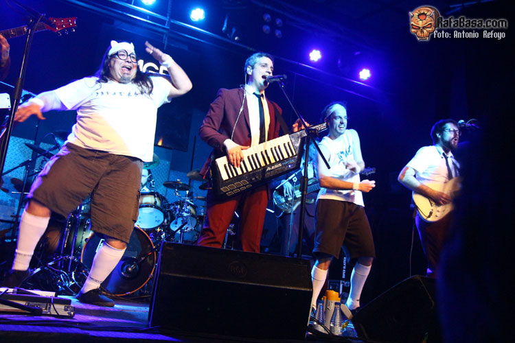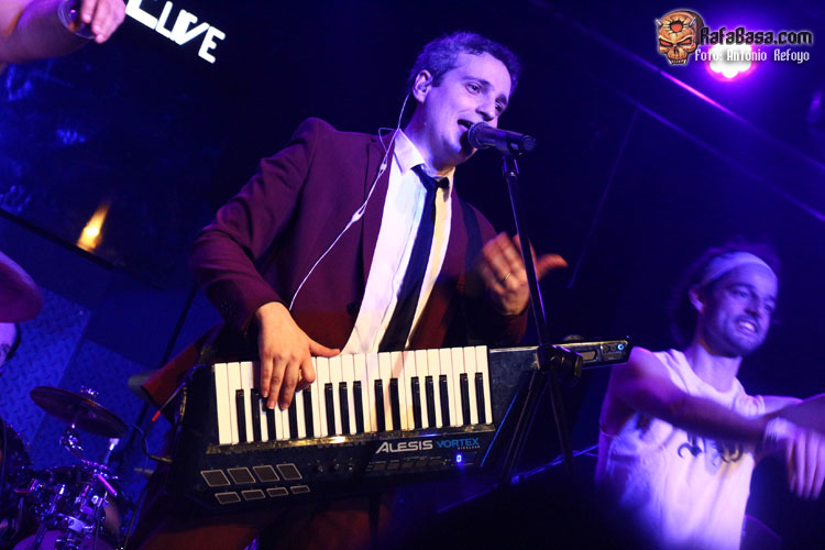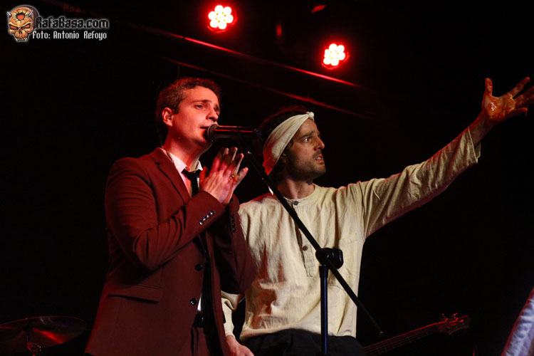 Entre apuntes jocosos la descarga continuaba con “Fundido A Negro”, con un par de personajes ataviados con trajes y mascaras dando una imagen apocalíptica. Y es que no por encontrarnos ante una banda con sentido del humor, sus letras dejan de tener mucho significado. Al margen de que todos los componentes son excelentes músicos cabe destacar que además son multinstrumentistas que sacan a relucir muchos recursos.