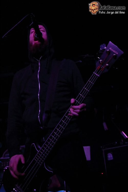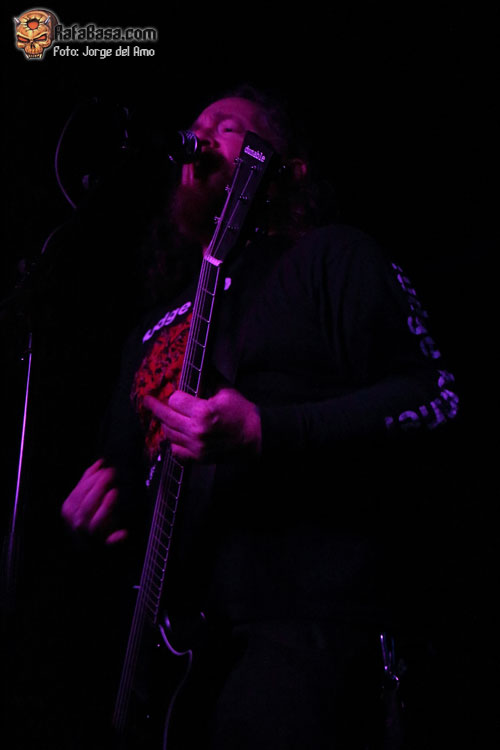 A eso de las doce menos diez más o menos, el trío de Liverpool terminaba sus últimos preparativos, y sin avisar comenzaba la tormenta con “Prosper On The Path”, con un sonido en general bastante pobre, y un Jon Davis cuya voz se escuchaba más o menos como si saliera de un loro de esos de juguete. Terminado el tema, Jon mandaba apagar por completo el puente de luces que la banda tenía justo delante, dejando una triste iluminación trasera y a ellos tocando completamente a oscuras, como 3 siluetas endemoniadas castigadoras de cuellos. El sonido seguía sin salir como es debido, en cualquier lado de la sala. No fue hasta la descomunal “Throne Of Fire”, que CONAN empezaron a castigar oídos también, y la cosa mejoró notablemente. A Jon se le veía más cómodo, el volumen aumentó, también los graves, y ellos sonaban a una versión mucho más cercana a ellos mismos, aún lejos del sonido apocalíptico que les hemos disfrutado otras veces, pero algo decente.