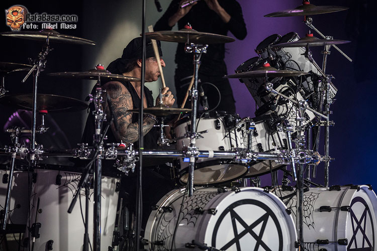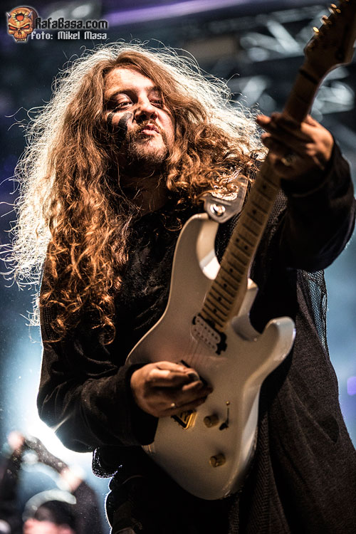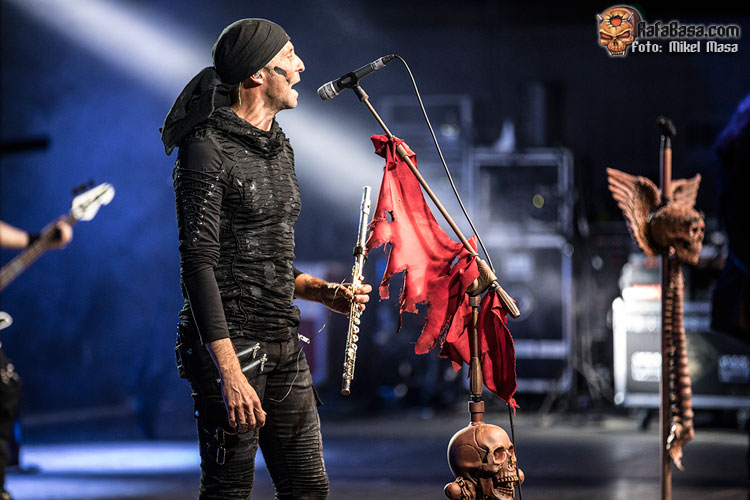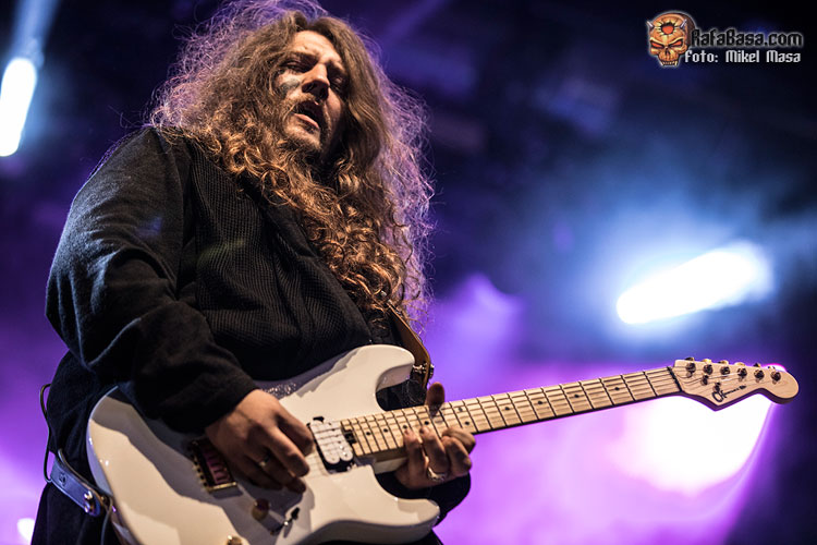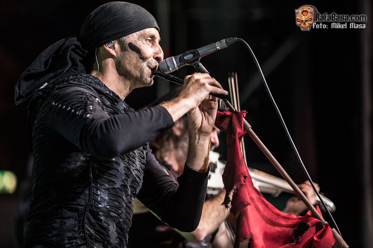 Tras rematar “El amor brujo”, Zeta nos dio las buenas noches y la bienvenida al “apocalipsis de MÄGO DE OZ”. “Esta noche se acaba el mundo”, concluía antes de que la banda empezara a tocar “Xanandra”, uno de los singles de Hechizos, pócimas y brujería y que fue bastante aplaudido. Le siguió “Cadaveria”, que empezó con una ráfaga de fuego frío, y las calaveras al estilo mexicano en las imágenes de la pantalla posterior.