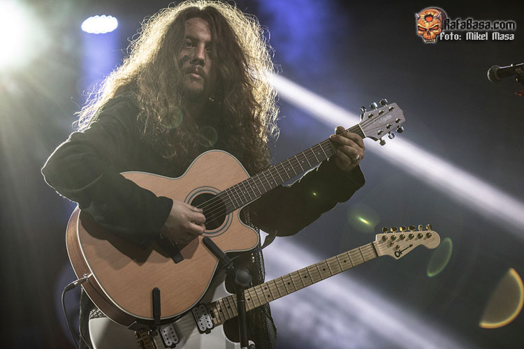 Unos cinco minutos después de la hora prevista cayó el telón y, a oscuras, ya veíamos a casi todos los miembros de MÄGO colocados en el escenario con la ropa que lucen en las fotos promocionales de Ira Dei, muy post-apocalíptica. Empieza a sonar la intro del disco, “Jerusalem D.C”, al mismo tiempo que se proyecta su vídeo correspondiente en la pantalla que preside la parte posterior.