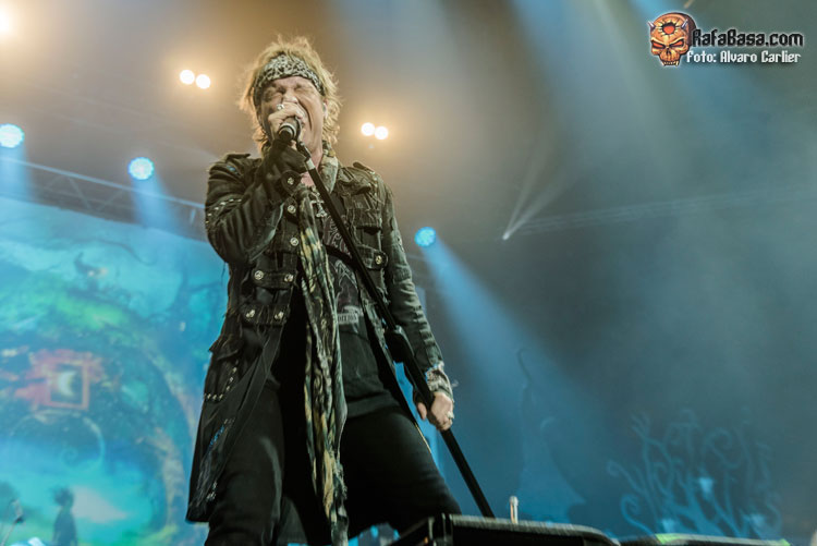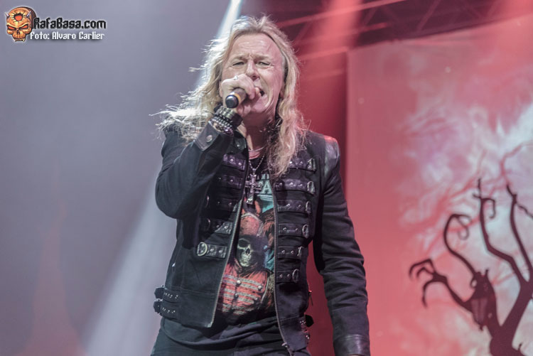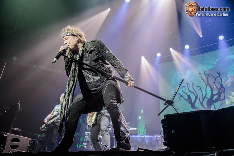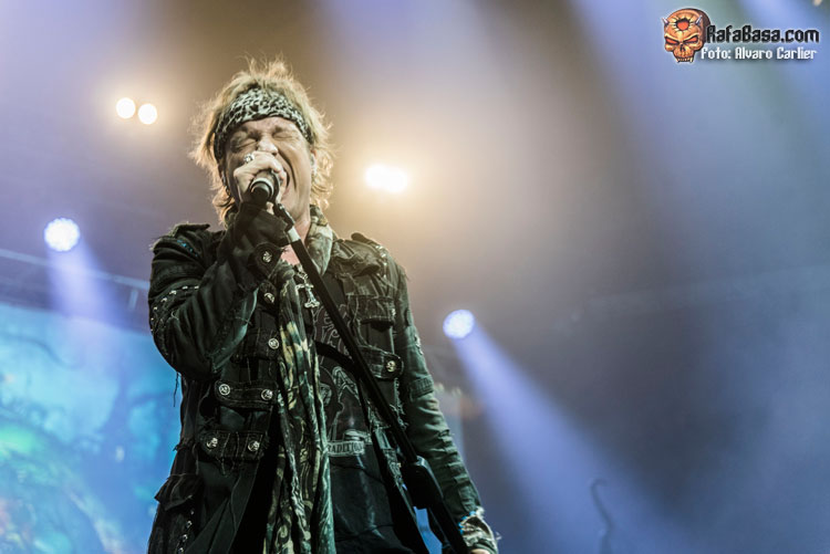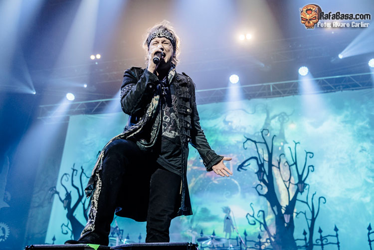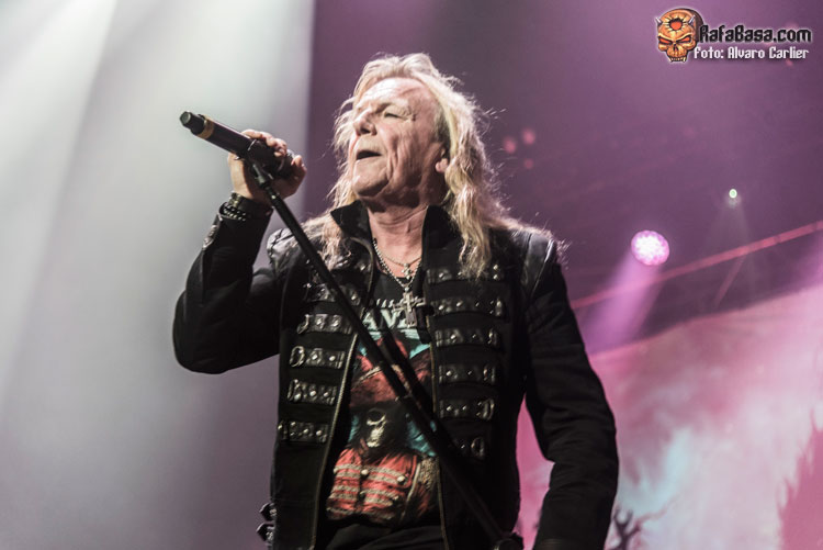 “Alchemy” sería el momento de Geoff Tate, tirando de clase, galones y vozarrón, aunque la línea de su micrófono estuviera algo baja en los primeros compases. Los coristas Adrienne Cowan, Ina Morgan y Herbie Langhans tomaban posiciones en la pasarela alta dejando momentáneamente la plataforma que tenían al lado derecho. A continuación, la balada “Invincible” sería otro momento para el lucimiento del otrora vocalista de QUEENSRYCHE, cantándola junto al teclista Miro y un Tobias alucinado que nos gritaba “Madrid, this is fucking Geoff Tate!” justo antes de reconocer la labor y trayectoria del de Seattle, quien influenciara en sus inicios al mismísimo Michael Kiske.