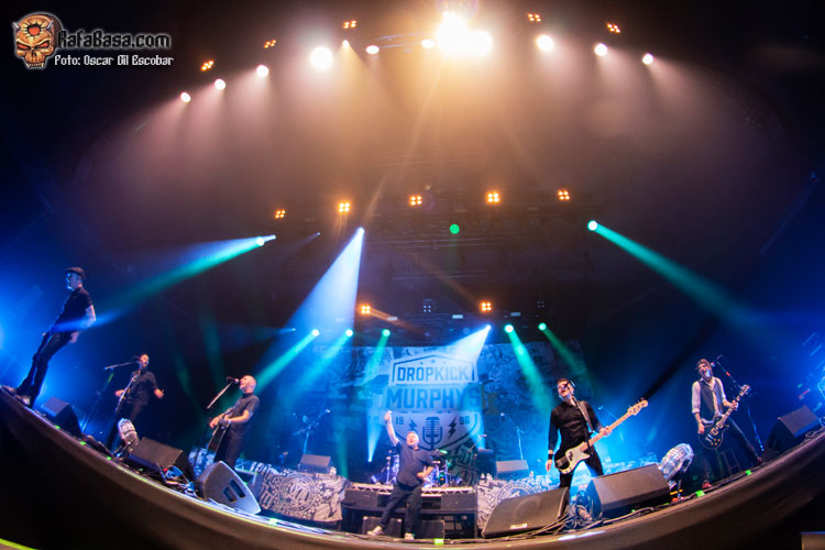 Los de Massachusets se hicieron de rogar un poco más de lo previsto. Con el telón echado, empezaba a sonar la magistral voz de Sinéad O’Connor, que creo que jamás dejará de erizarme el vello, y tras la lona negra empezaban a recortarse siluetas cuando empezaba a sonar “The Lonesome Boatmen”, que sirve también de intro, con un Palacio casi hasta la bandera, sólo con algunos huecos en las gradas y quizás algo de espacio en pista en la parte trasera. Aquí ya se adivinaban las ganas de fiesta de una mayoría muy ruidosa, nada silenciada, en contraste con las actuaciones previas; y es que un concierto de DROPKICK MURPHYS no se parece absolutamente a nada que uno haya visto antes.