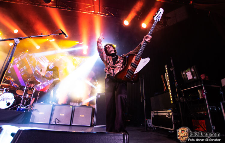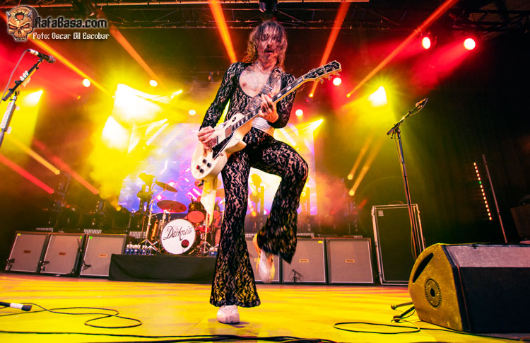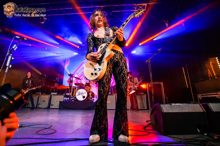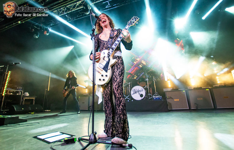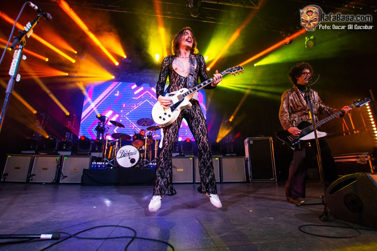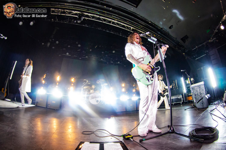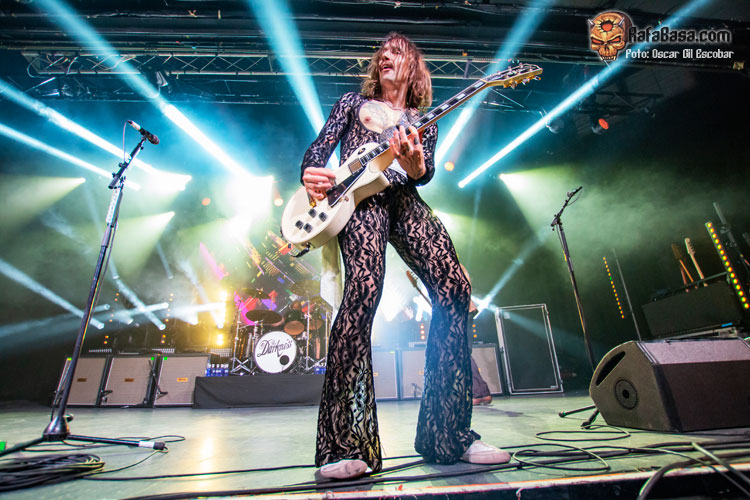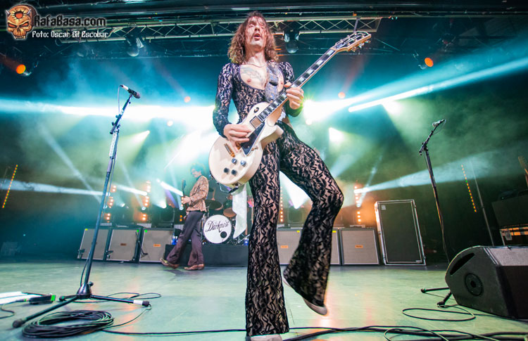 Pequeño descanso y vuelta al escenario con nueva indumentaria, más atrevida y más clásica acorde a lo que ha sido siempre THE DARKNESS. Y las hostilidades empezaban con un “One Way Ticket” que ponía a saltar a toda la pista y a cantar ese archiconocido estribillo mágico que llegó como agua de mayo para terminar de meter en faena a un público que ahora sí estaba al cien por cien dentro del show. “Barbarian” es un acierto total, uno de esos temas que no te dan respiro y que te hacen apurar la garganta intentando imitar los agudos imposibles del señor Hawkins. Más fiesta y más saltos a ritmo de una maravillosa “Growing On Me”, enlazando con un nuevo clásico como es “Japanese Prisoner of Love” o la preciosa “Love Is Only a Feeling”, en la que movíamos los brazos de lado a lado acompañando al ritmo y melodía de este grandísimo hit.
