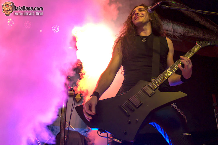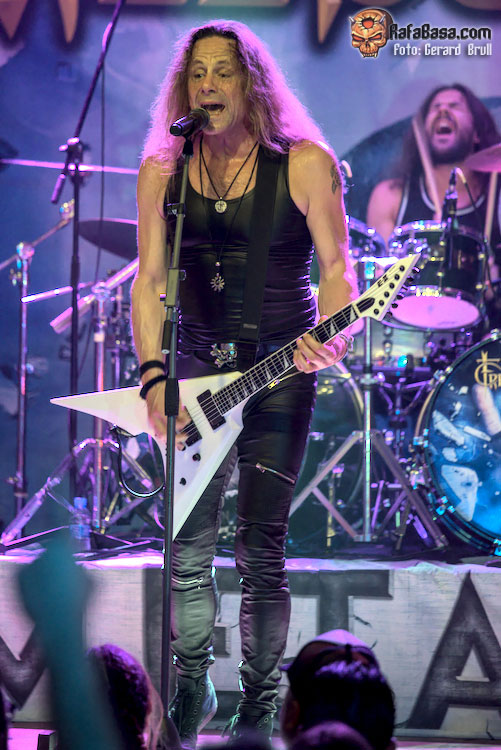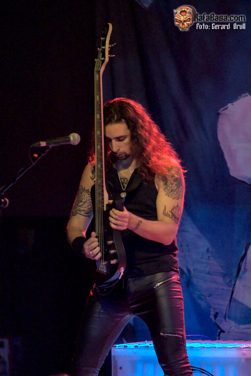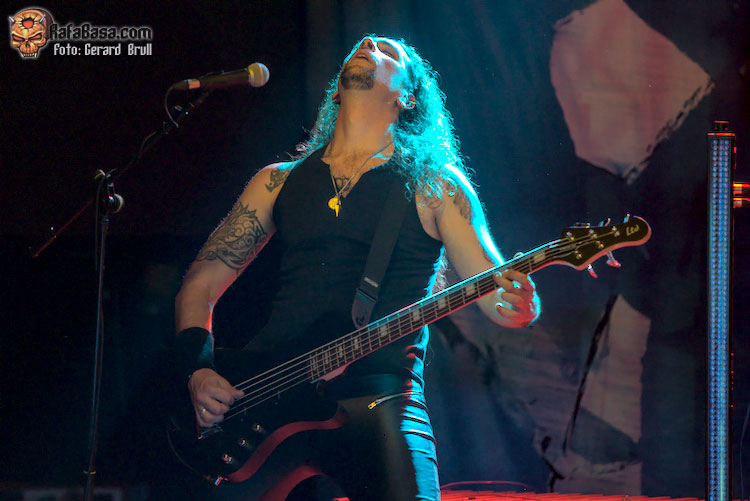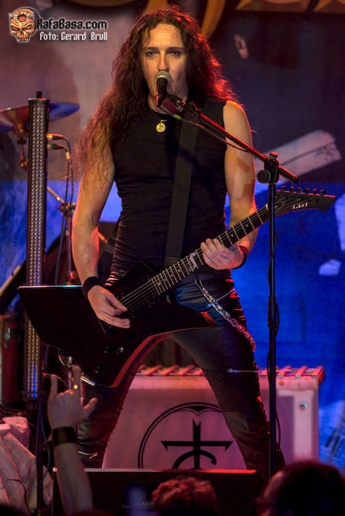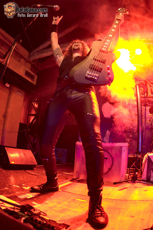 Sonriente, simpático, y bromista, Chris no quiso dejar la ocasión de reivindicar la longevidad de la banda, recodándonos que llevan más de dos décadas en activo y defendiendo el metal. Así que tras recibir la afectuosa ovación de sus fieles el cuarteto se abalanzó sobre otra de sus clásicas cabalgadas, con las guitarras sonando veloces y melódicas a lo largo de “Metal Invasión”, que nos dejaba la estampa del bajista italiano fusilándonos sin compasión mientras Chris volvía a demandar nuestra colaboración a la hora de acompañarle en los grandilocuentes coros. Mientras sus compañeros se posicionaban sobre las tarimas que flanqueaban la batería, Chris nos pidió ayuda para deletrear el nombre de la pieza que presta título a su nueva entrega “M.E.T.A.L.”, así que tras jugar un rato con el personal la banda se abalanzó sobre el tema para acabar recabando una fastuosa ovación.