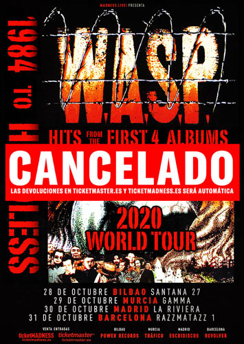 Debido a la crisis global del Covid lamentamos anunciar que el tour de W.A.S.P. "1984 to Headless" se ha cancelado. Todos los tickets online serán devueltos automáticamente (no es necesario solicitar la devolución para compras online). Esperamos poder volver con nuevas y emocionantes noticias muy pronto.
