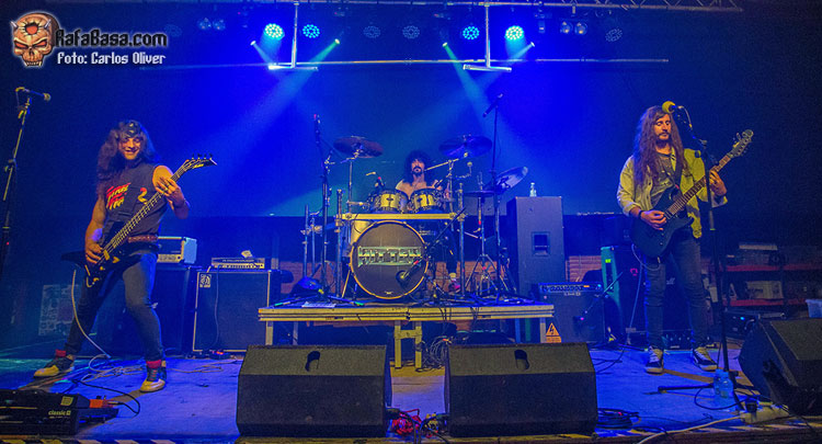 Como sucede con muchas formaciones en nuestro país, -y en casi todo el mundo-, los meses de pandemia han frenado la progresión y la actividad en directo de LÖANSHARK, por lo que el concierto de esta noche suponía el regreso a los escenarios del trío barcelonés. Quizás por ello se les vio algo nerviosos durante los compases iniciales de su presentación, e incluso me dio la sensación que temas como el inicial “Turn It Louder” sonaron más rápidos de como los suelen tocar habitualmente. Pero como comentaba anteriormente el trío que conforman el guitarrista y vocalista Lögan Heads, el bajista Aless Oppossed y el batería Ángel Smolski, son una banda de solvencia y que hace tiempo que se están pateando los escenarios, así que no tardaron en tomarle el pulso a la velada a base de proponernos trallazos incontestables como el explosivo y guitarrero “Black Leather Queen”, que con sus fraseos deudores del legado de las bandas míticas de la N.W.O.B.H.M., se encargaba de darnos excusas para agitar frenéticamente la cabeza a la vez que el trío iba caldeando el ambiente en una sala cada vez más animada y concurrida.