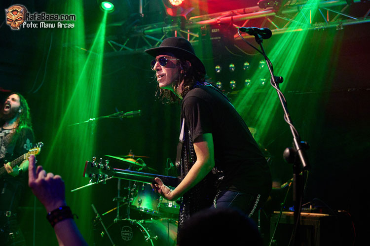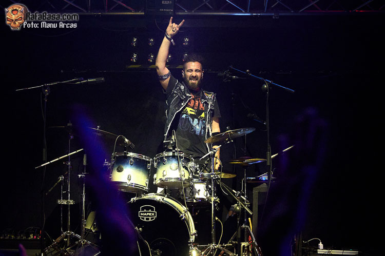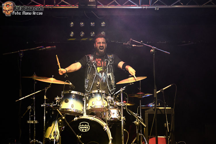 Tras estos dos primeros cañonazos en clave bastante metalera, presentación de la banda y ataque directo con la más hard rockera “Patrulla”, magnífica pieza desarrollada sobre un texto del ilustre escritor Manuel Vicent que cuenta una triste historia con el mundo de las drogas como telón de fondo, dentro de un ritmo vivo y dinámico. Bajó un poco el tempo con “Terrateniente”, buen tema, pero algo menos intenso, repuntando con la reivindicativa “Es Momento de Luchar” una de las más celebradas por el público que la coreó compensando lo bajo que sonó la voz de Pablo desde la batería haciendo las veces de Enrique Villarreal “El Drogas” que puso su personal aportación vocal en la grabación en estudio.