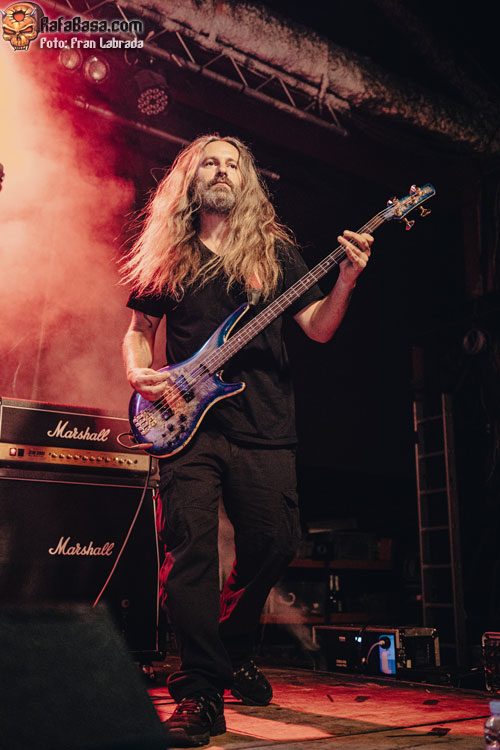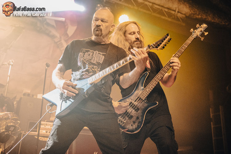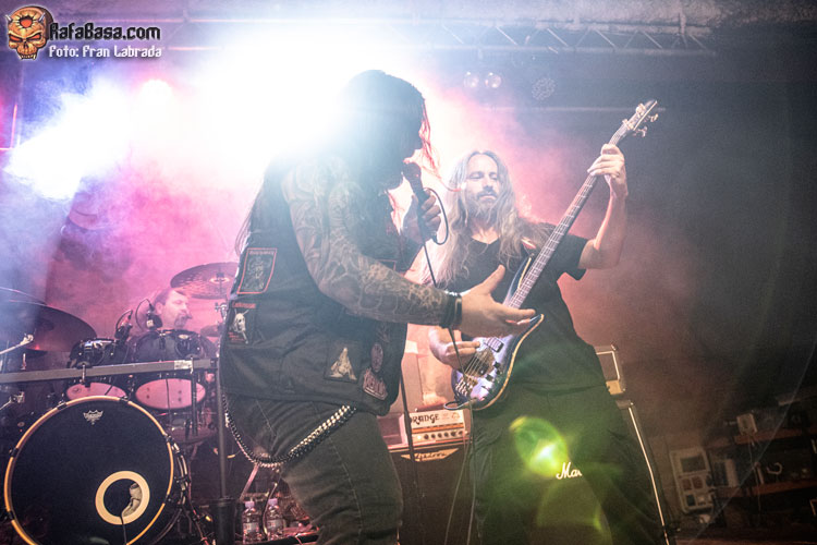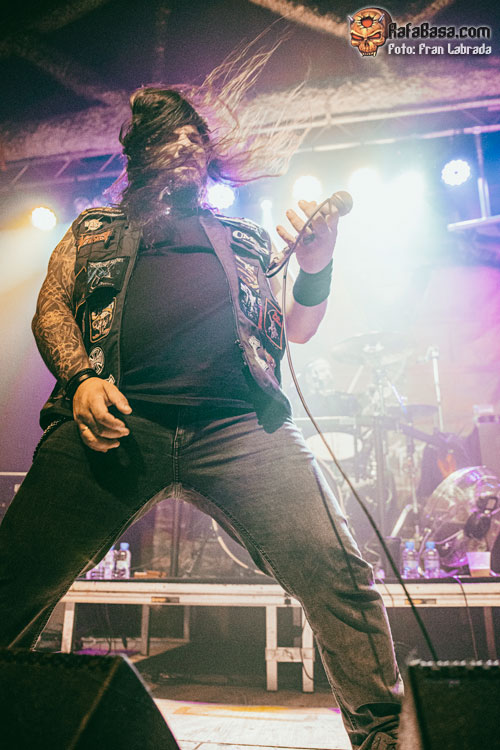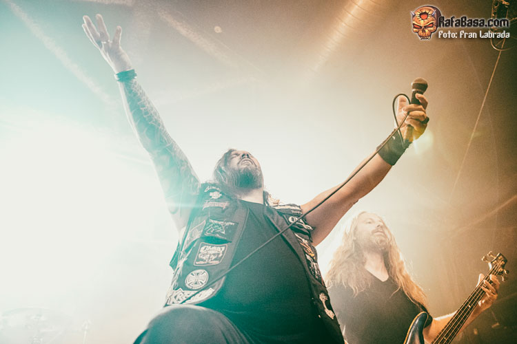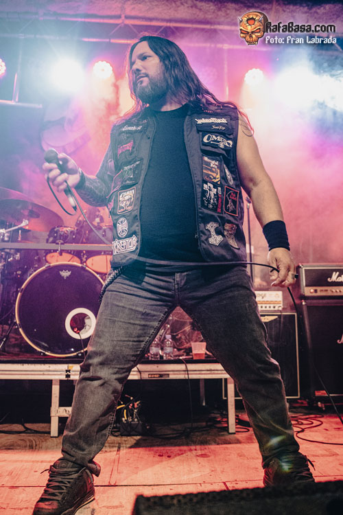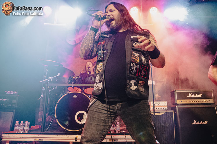Con los músicos exhibiendo una amplia sonrisa viendo la entrega y la devoción de un público que estaba disfrutando al máximo con su descarga llegaba el momento de respaldar al frontman griego a la hora de entonar las estrofas de “Ruby Eyes (Of The Serpent)”, para acabar dejando paso a esos desarrollos instrumentales deudores de las cabalgadas más tradicionales dentro del heavy metal. Con el respetable alzando los cuernos al aire, como si de un oscuro y arcaico ritual se tratase, nos adentrábamos de lleno en uno de los himnos clásicos del combo americano “The Axeman”, con un notable derroche vocal de Nikos Migus A. para acabar rubricando un tramo final apoteósico.