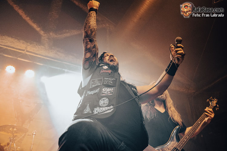 No había pues tiempo que perder. De modo que con la clásica e icónica serpiente que adorna sus portadas presidiendo el escenario la banda irrumpió en escena acompañada de una inquietante introducción para rápidamente desatar la euforia del personal con el primer trallazo de la noche: “Termination”, que nos dejaba con la primera ración de velocidad, afilados riffs y la impecable interpretación del vocalista griego Nikos Migus A., que ejerciendo como frontman no tuvo dificultades para conectar con las primeras filas. El ritual de Powell y sus acólitos no había hecho más que comenzar, de modo que tras una primera toma de contacto, que sirvió también para que todos alzáramos nuestros puños, era un buen momento para abandonarse al headbanging con los aromas netamente “true” de una de las que incluyeron en su primer largo “Dragon’ s Breath”.