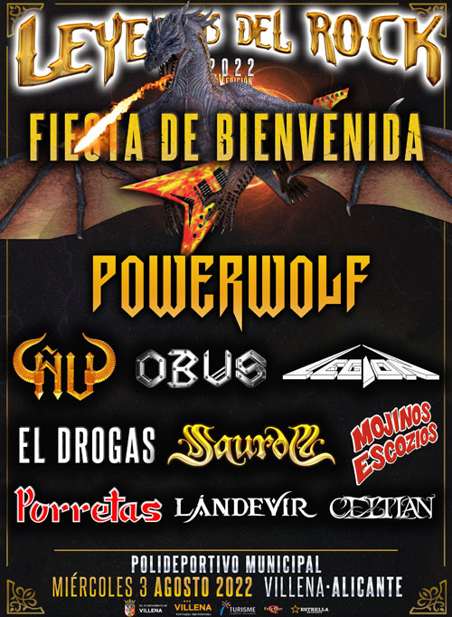 POWERWOLF estarán acompañados ese día por algunas de las bandas más míticas de la historia de nuestro rock, como ÑU, OBÚS y El Drogas de BARRICADA, así como el emocionante retorno a los escenarios de Legion, la mejor banda de thrash metal de su época. Cierran el cartel grandes bandas como SAUROM, MOJINOS ESCOCÍOS, PORRETAS, LÁNDEVIR y CELTIAN. El precio del ticket para ese día sigue siendo de 25€ + gastos y es de acceso gratuito para todos los poseedores del abono LEYENDAS DEL ROCK.