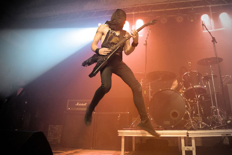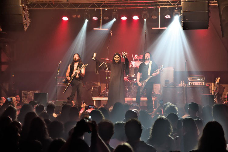 Evidentemente tampoco se olvidaron de su personal interpretación de las míticas cabalgadas herederas del sonido más clásico de la N.W.O.B.H.M. durante la instrumental “Flight Of The Manticore”, que nos dejaba la imagen de Jarvis paseándose por la barra del local. Pero sin duda lo mejor estaba aún por llegar, ya que para encarar la recta final del show el trío contaría con un invitado muy especial. Así que la propia muerte se personaría sobre el escenario empuñando un cáliz durante la interpretación de otra de las imprescindibles en sus directos “The Chalice”, que se cerraba con una rotunda ovación.