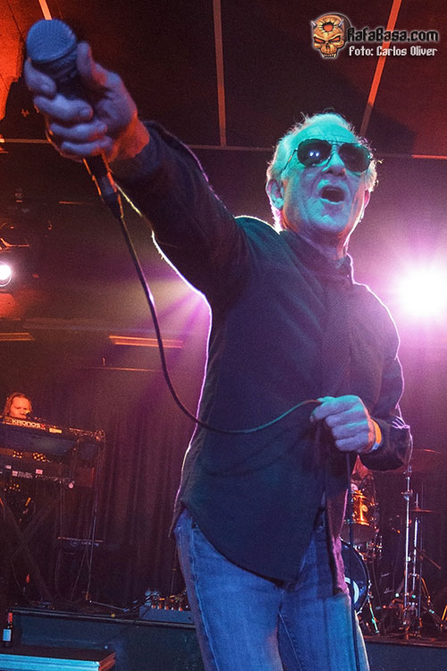 Sobre las 21:30 horas, aproximadamente, por fin se alzaba el telón que ocultaba el escenario de miradas indiscretas para que los músicos que acompañan a Mr. Bonnet dieran el pistoletazo de salida a la velada. Evidentemente, como no podía ser de otra forma, el último en ganar el escenario de una sala Wolf que acabó registrando una muy buena entrada fue Mr. Graham Bonnet, quien apareció elegantemente vestido de riguroso negro, luciendo una finísima corbata roja, y sus inseparables gafas de sol para dar buena cuenta del primer clásico de la noche “Eyes Of The World”, inundando de melodía y buen gusto el local mientras invitaba a corear al personal el estribillo e intentaba reservar “fuerzas vocales” para lo que sería el resto del show. Y es que, como es lógico, a los 75 años Mr. Bonnet ya no conserva ni el rango ni la potencia de antaño. Eso sí, me pareció que en esta ocasión no tiró de samplers ni pistas pregrabadas, salvo en el caso de los coros, ya que en temas como “All Night Long”, que contó con las palmas del público en el arranque, sonaron perfectamente cuadrados y armonizados.