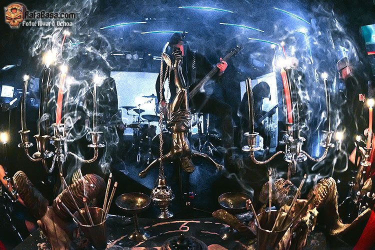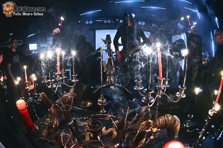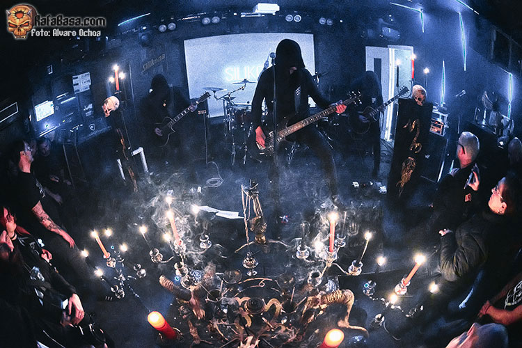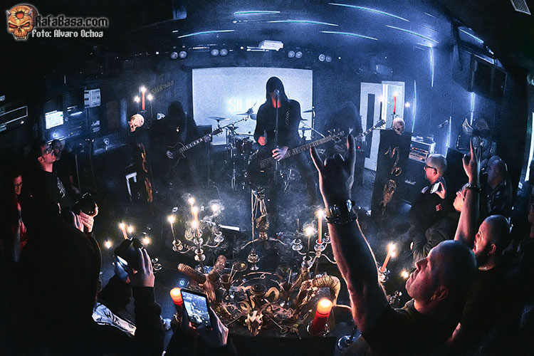 El silencio y la oscuridad se apoderaron de la Silikona, sólo las luces de las velas rojas y negras del altar iluminaban la sala, calaveras, cruces invertidas y candelabros lo adornaban todo, y el misterioso cuarteto aparecía detrás, cubiertos por túnicas negras, irreconocibles, como si se tratara de espectros.