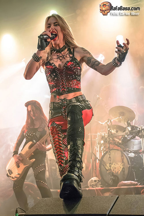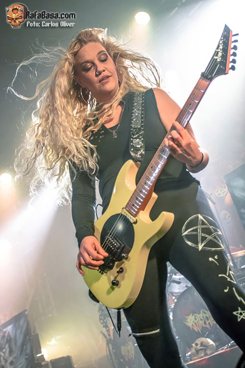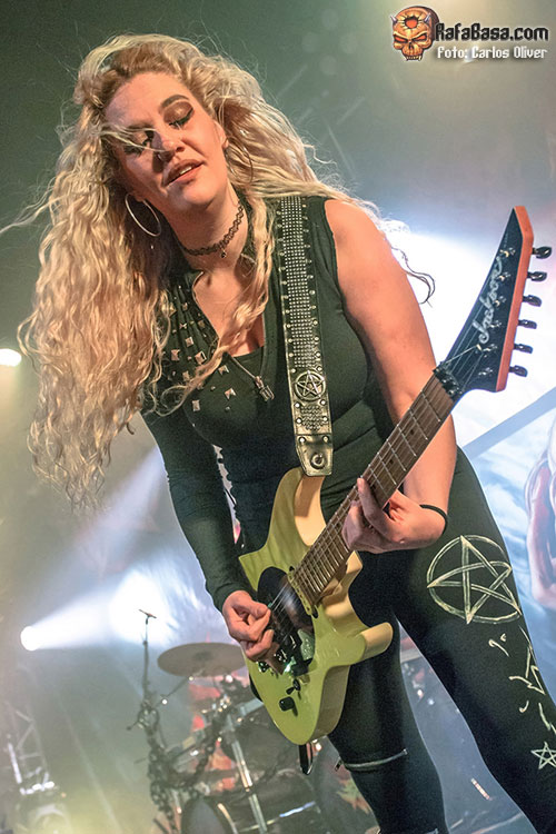Un oscuro interludio, con las chicas entre bambalinas mientras las columnas de humo se alzaban, serviría como introducción para la pieza que presta título a su último lanzamiento “Inquisition”, con las instrumentistas de la banda abandonándose al headbanging mientras Laura se inclinaba para mostrar sus cuernos a los integrantes de las primeras filas y tras ella aparecía una hechicera encapuchada. Entre tanta velocidad, intensidad y, por supuesto, humeante heavy metal, BURNING WITCHES también tendrían ocasión de mostrarnos su buen hacer a la hora de encarar temas más relajados como “Relase Me”, que fue uno de los pocos momentos en los que pudimos ver a Romana hacerse cargo de la parte solista, ya que durante la mayor parte del show fue, su socia a las seis cuerdas, Courtney Cox, quien se encargó de esos menesteres, dejando fiel testimonio de su técnica y talento.