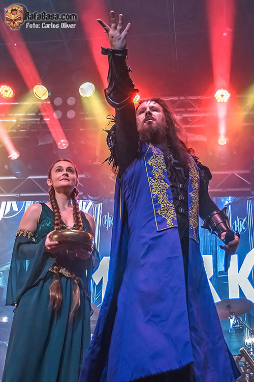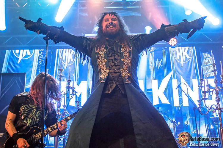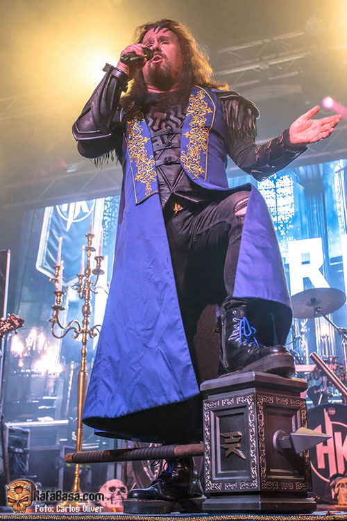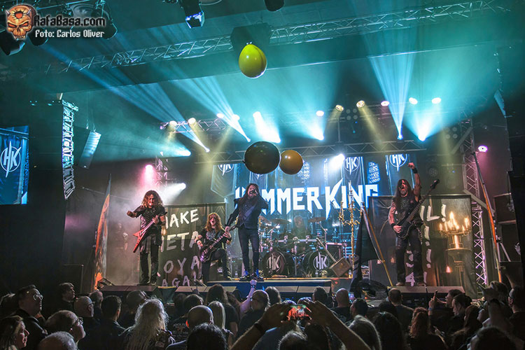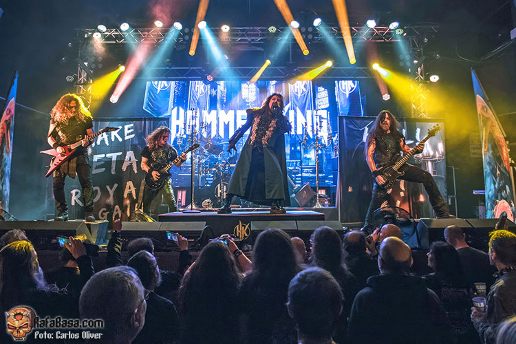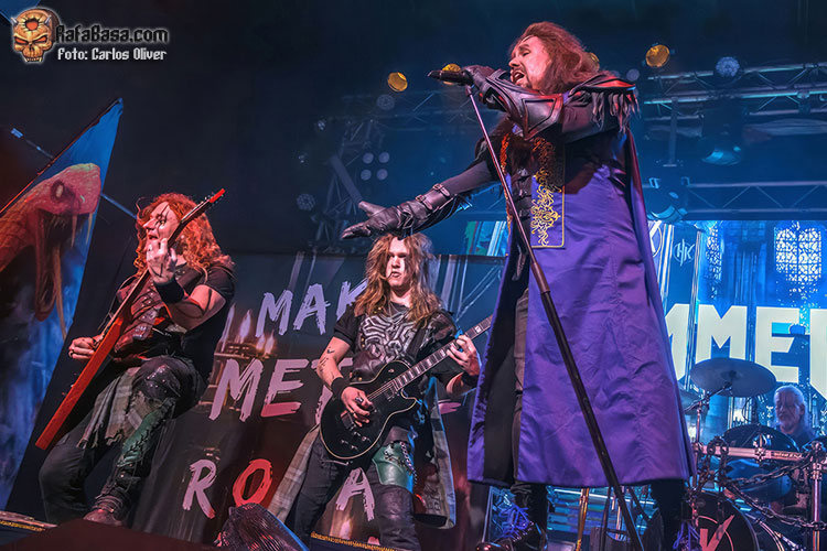 Precedidos de una grandilocuente y, por momentos, cinematográfica introducción HAMMER KING se adueñaban del escenario, blandiendo su frontman con orgullo un martillo, para dar por inaugurada su presentación con el empuje y la rotundidad netamente metalera que desplegaron a lo largo de “King For A Day”, dejando claro que los coros, pese a sonar disparados, iban a ser imprescindibles para aportar esa orientación épica que aguardaban todos sus seguidores. Tras haber roto el hielo, Titan Fox V, encaramado sobre una de las pequeñas tarimas que había colocadas en la parte frontal nos invitaría a participar, coreando tanto la melodía como el estribillo, en la pieza que presta título a su última entrega de estudio, “Make Metal Royal Again”, que encendía los ánimos del personal.