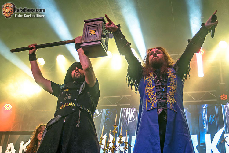 Una vez más, tanto el Mayordomo como la Doncella volverían a tomar posiciones junto a los músicos durante “Hoheitsgebeit”, ondeando sendas banderas con el logo de la banda mientras su frontman blandía una corona que mostró orgulloso al público. Encarábamos lo que fue la recta final de su estreno en los escenarios barceloneses con el primer tema que escribieron hace ya más de una década: “I) Kingdom Of The Hammer King”, que provocó que gran parte de los presentes levantáramos los puños para sumarnos a la hora de cantar con ellos. Con la banda formada en la parte trasera del escenario parecía que su descarga había finalizado. Sin embargo, Titan Fox V entonó “The Last Kingdom” mientras sonaba la música enlatada y sus compañeros permanecían inmóviles tras él y ya sin portar sus respectivos instrumentos.