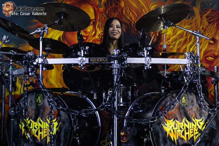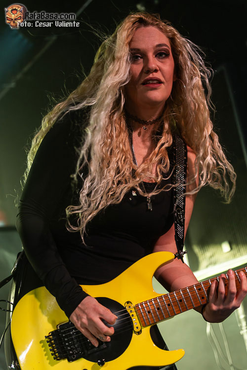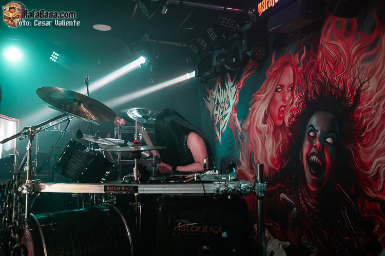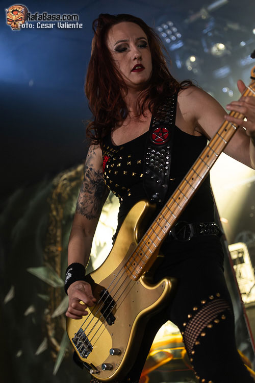 Charla por aquí, visito el puesto de merchandising por allá… cuando nos quisimos dar cuenta, la crew había preparado un escenario muy efectivo para que BURNING WITCHES conjuraran sobre él. La batería colocada sobre una tarima, un telón gigante con la portada de su último «Inquisition» y otros cuatro paneles laterales que vestían el escenario casi por completo de calaveras, serpientes y demás imaginería malévola, serían testigos de los conjuros que las chicas más heavies del lugar tenían preparados para nosotros. Me complace comprobar cómo la banda no solo graba discos con regularidad y gira sin más, sino que invierte en su futuro como grupo profesional y trata de dar ese plus que una propuesta como la suya merece. Cuando empieza a sonar la oscura y apocalíptica introducción «Sanguini Hominum», de su más reciente «Inquisition», el escenario se tiñe de rojo y un llamarazo da la bienvenida a una noche de la que esperamos guitarras afiladas, riffs de vieja escuela y escuchar la prodigiosa voz de Laura Guldemond desgañitarse… ¿conseguiremos el objetivo? «Soul Eater» nos asalta como una patada en la cara, sonando muy contundente, con una Laura espectacular (¡qué carisma!), Lala pegándole muy duro a la batería, Jeanine meneando su roja melena mientras aporrea su bajo con ganas, la gran Courtney Cox manteniéndose a un lado, concentrada en darnos una actuación de calidad, y Romana… ¿qué decir? A pesar del peso que tiene en la banda, he de decir que las guitarras rítmicas las ejecuta sobradamente, pero, al menos esta noche, creo que debería haber delegado en Courtney llegado el momento de realizar los solos más complejos, y el acabado en algunos temas habría sido aún más espectacular. No obstante, la energía que se mostró en «Shame» nos encandiló a todos, que no dejábamos de alabar a una Laura que no solo es una increíble vocalista que lo da todo sin restar matices a su voz, sino que es una frontwoman de los pies a la cabeza. De esas que poco se ven a día de hoy por los escenarios.