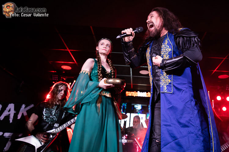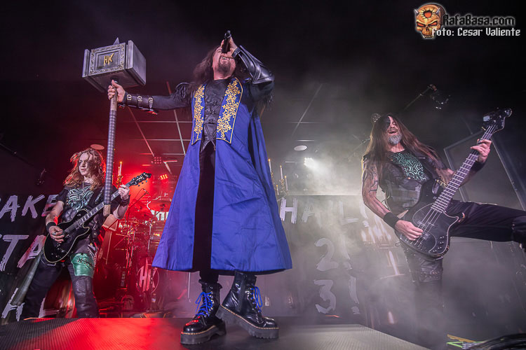 Justo antes del aquelarre se presentaba un escenario con candelabros, bien adornado con telones, así como una estética escénica que podría haber acompañado a los primeros POWERWOLF y que, en realidad, es parte de la performance de una banda mucho menos conocida que la de los rumanos. HAMMER KING salían al escenario con mucha energía, retazos teatrales y un martillo en alto sostenido por uno de los actores que acompañaban a los germanos, lo que de inmediato nos recordó a unos tales HAMMERFALL … un cliché como cualquier otro, que siempre es bienvenido en un concierto de heavy metal. Patrick Fuchs (aka Titan Fox V) es el maestro de ceremonias, portando un imponente y adornado abrigo, mientras que se observa un fuerte contraste estético y de edades entre los dos guitarristas, que parecen compenetrarse bastante bien. «King for a Day» no descubre nada que no hayamos escuchado en otras bandas, pero… ¡vaya! Aunque la batería suena enrarecida y un tanto artificial, la voz de Patrick Fuchs da la talla, y el enorme esfuerzo por agradar de todo el line up hizo que su espectáculo fuese de menos a más, creciendo exponencialmente a cada segundo y ganando a un público que empezó poniendo cara de “meh…”, y a los pocos minutos estaba interactuando con la propuesta de HAMMER KING. Su nuevo disco sería protagonista con la hímnica, sencilla y cargada de coros pregrabados «Make Metal Royal Again». Os mentiría si no dijera que escuché a Titan Fox V pasarlo mal en algunos tonos, pero el sonido mejoró muchísimo y era tal la simpatía y el esfuerzo de toda la banda por ofrecer un espectáculo grande en formato reducido que nos arrastró a todos.